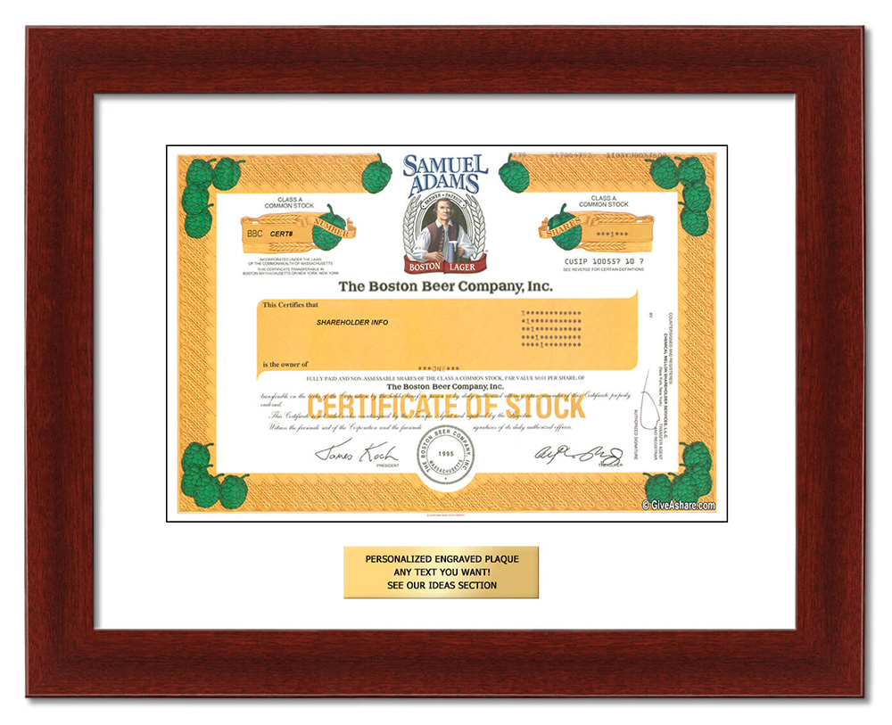 One real share of Boston Beer stock packaged as a gift. The recipient becomes a real shareholder of The Boston Beer Company entitled to all shareholder perks. Let them OWN what they love!